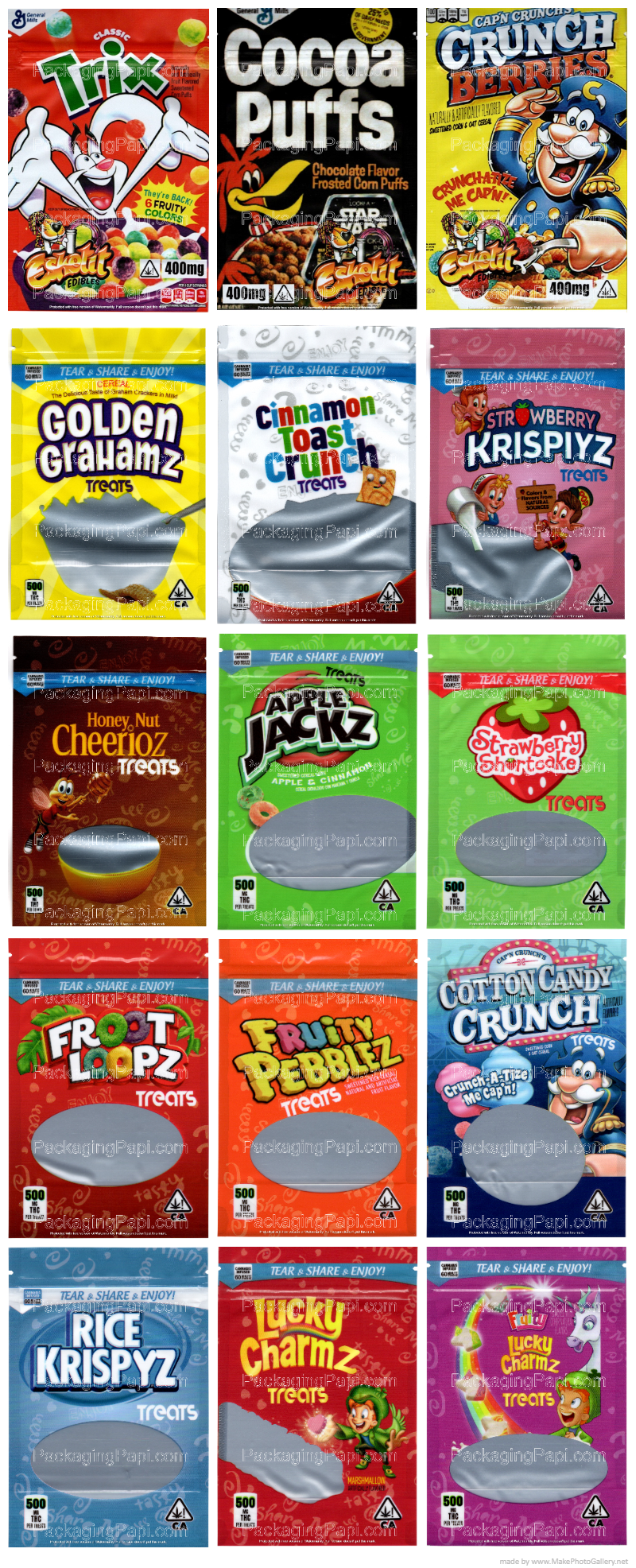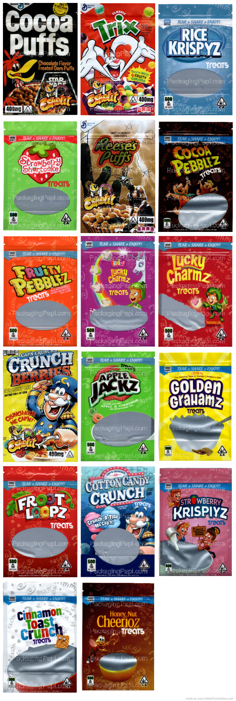 | Design Variations | Apple Jackz, Captain Crunch Berries, Cinnamon Toast Crunch, Cocoa Pebblezz, Cocoa Puffs, Cotton Candy Crunch, Fruit Loopz, Fruity Pebblez, FRUTIY Lucky Charmz, Golden Grahamz, Honey Nut Cheerioz, Lucky Charmz, Reeses Puffs, Reeses Puffs (Regular), Reeses Puffs Special (TS), Rice Krispyz, Strawberry Krispiyz, Strawberry Shortcake, Trix |