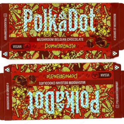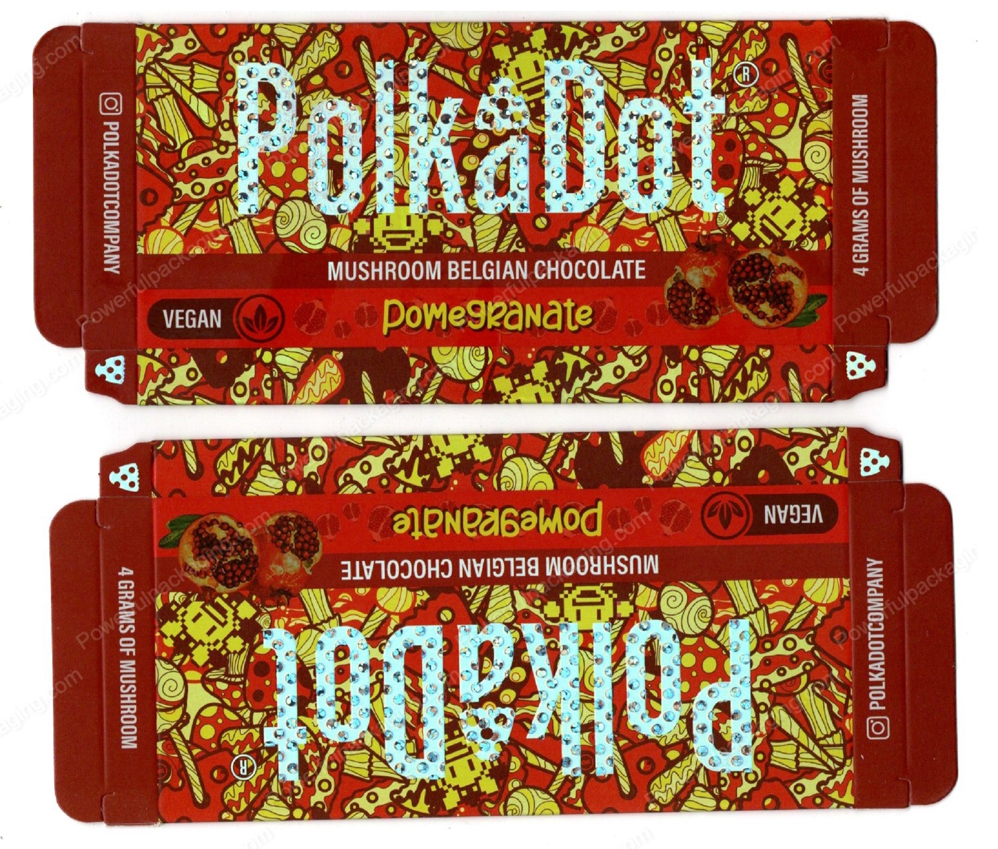 - PolkaDot Magic Mushroom Belgain Chocolate : Pomegranate V2 Vegan 4g 10-Pack with Master Case (5×2.5in) *Empty Box* (CaSupply)